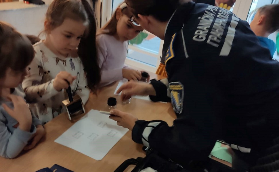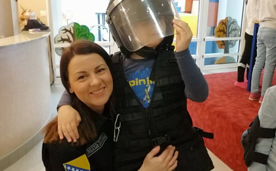 Children were introduced to the work of various police agencies (DKPT BiH, SIPA, GP BiH) and were presented with police equipment. They showed great interest in the work of the police and asked various questions to policewomen. They were happy to try on some of the police equipment, as well as stamp passports and take fingerprints.